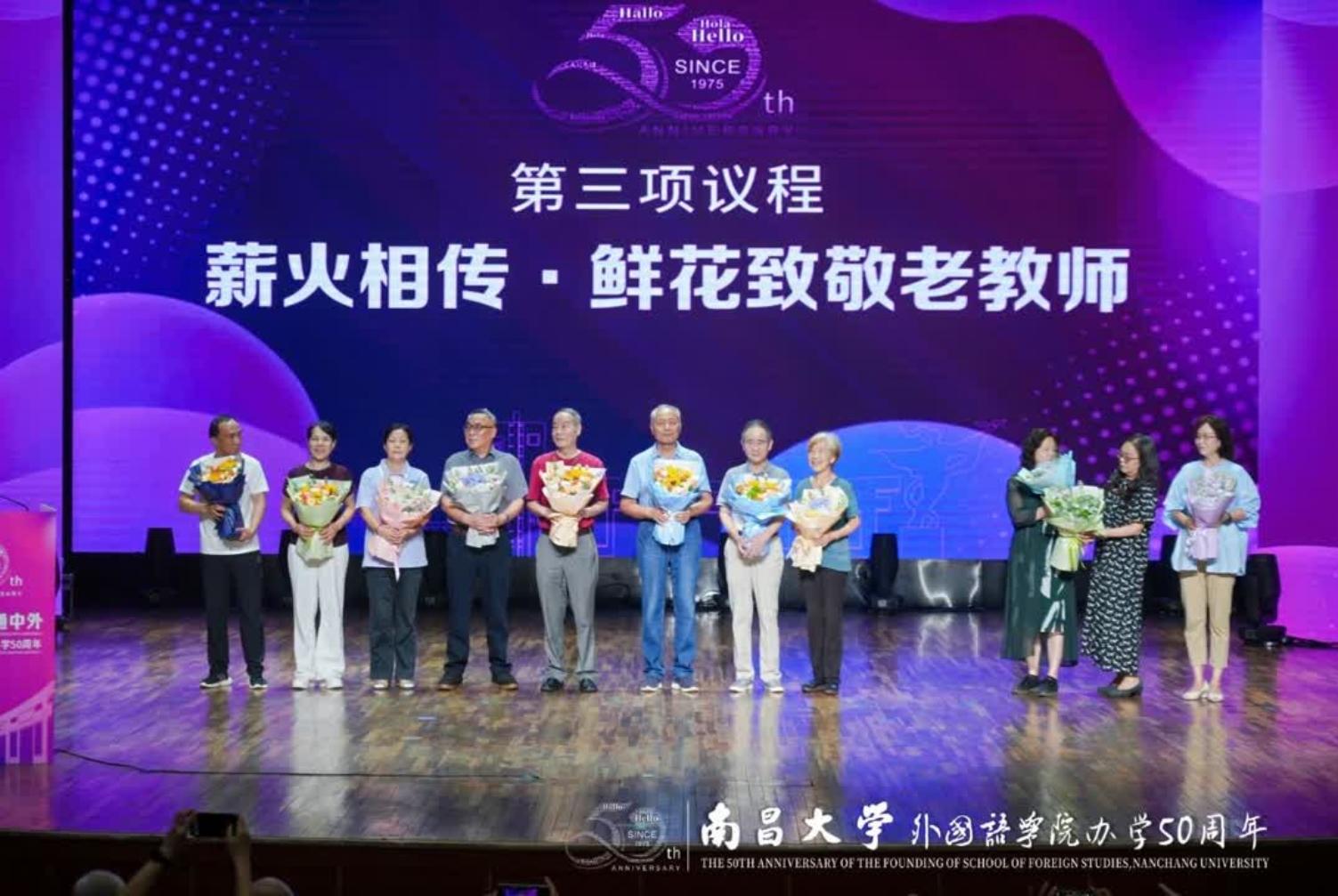 外国语学院办学50周年发展大会在庄严的国歌声中拉开帷幕。与会人员共同观看了学院五十周年发展历程专题片,回顾了学院“以语言为桥,连世界、育新人”的奋斗征程。学生代表向十二位躬耕教坛的老教师代表献上鲜花,表达对师者的崇高敬意。