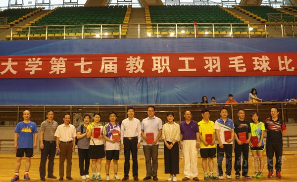 本网讯(学生记者侯丽娟、刘艺文)5月28日至29日,我校第七届教职工羽毛球比赛在前湖校区室内体育馆举行,来自校内各单位的22支代表队、200余名队员参加了比赛。校长助理、校教职工羽毛球协会会长李鸣参加比赛并为获奖队伍颁奖。