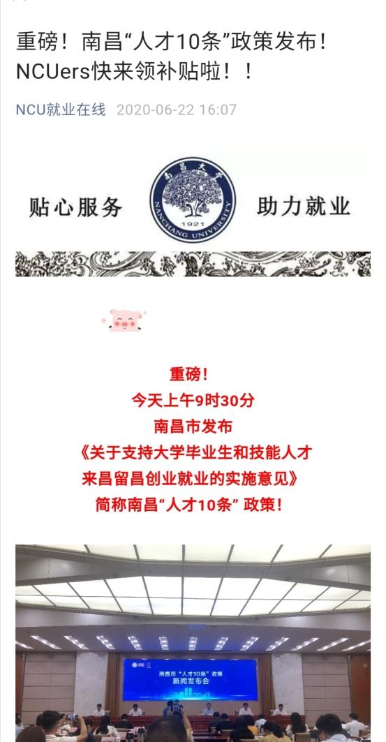 “NCU就业在线”订阅号推送“留赣留昌”就业的配套政策