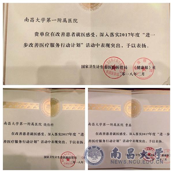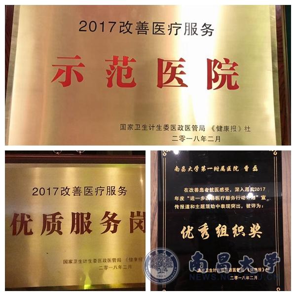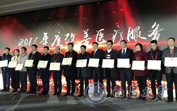 会上为2017年度改善医疗服务十大亮点、示范医院、优质服务岗、优秀组织奖颁奖,我校第一附属医院成为全省唯一一家囊括四项大奖的医院:入选“2017年度改善医疗服务十大亮点”、荣获“2017年度改善医疗服务示范医院”,烧伤科荣获“2017年度改善医疗服务优质服务岗”、信息处处长曹磊荣获“2017年度改善医疗服务优秀组织奖”。
