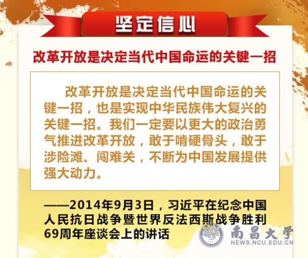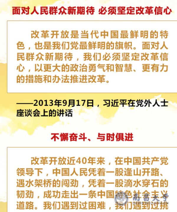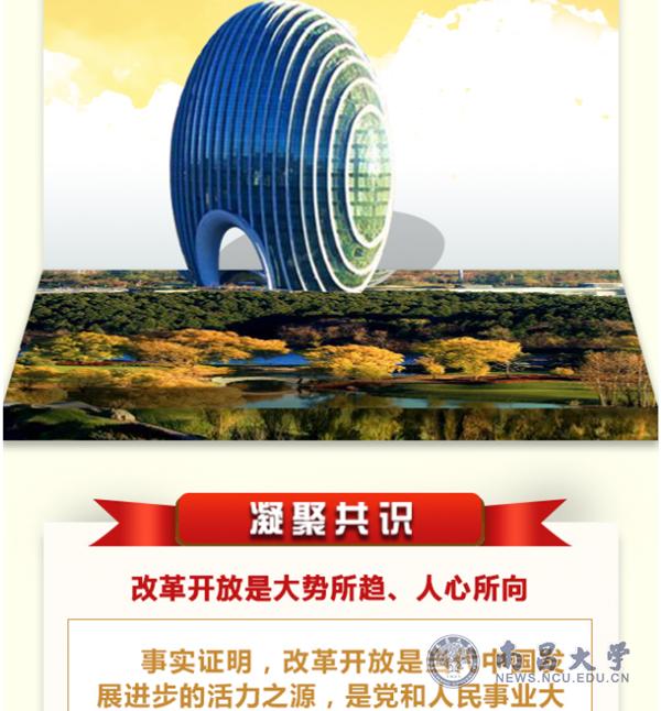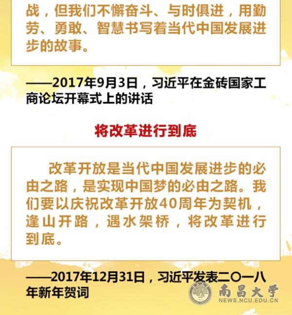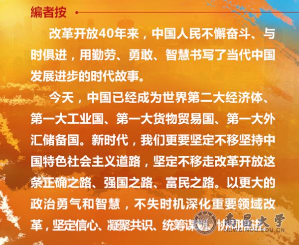 改革开放40年来,中国人民不懈奋斗、与时俱进,用勤劳、勇敢、智慧书写了当代中国发展进步的时代故事。党的十九大描绘了决胜全面建成小康社会、夺取新时代中国特色社会主义伟大胜利的宏伟蓝图,进一步指明了党和国家事业的前进方向。我们要坚定不移坚持以习近平同志为核心的党中央领导,坚定不移走改革开放这条正确之路、强国之路、富民之路,将改革进行到底。