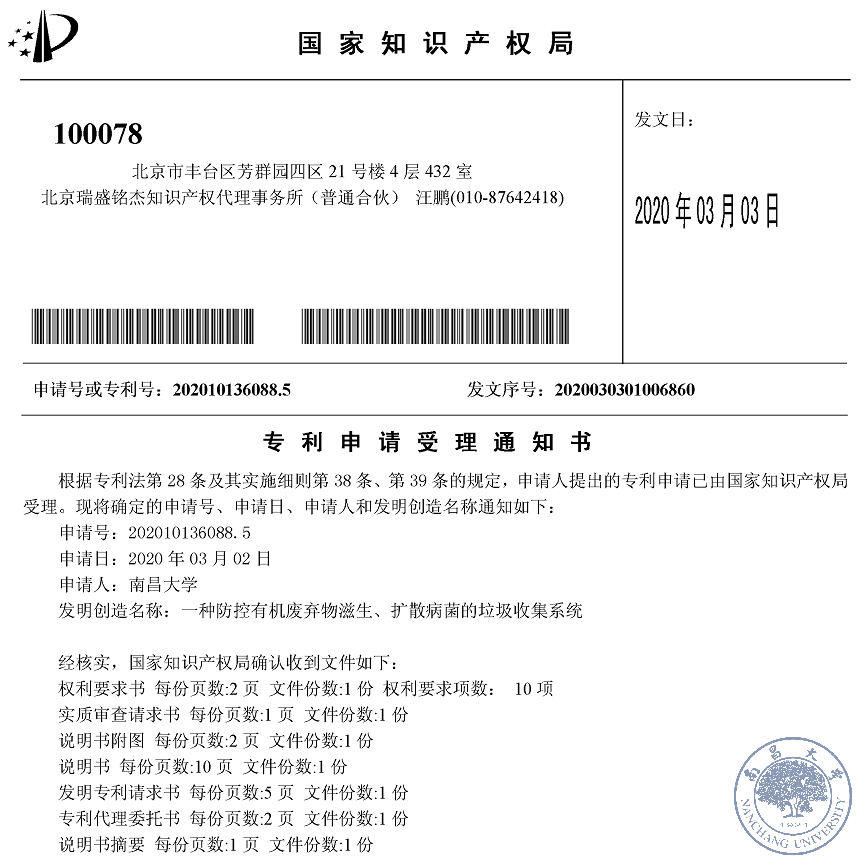 3月3日,国家知识产权局正式受理了 “一种防控有机废弃物滋生、扩散病菌的垃圾收集系统”发明专利的申请。吴代赦教授又马不停蹄地组织这种安全、环保、卫生的垃圾收集系统的生产加工,争取让科技成果早日转化成抗疫的生产力。