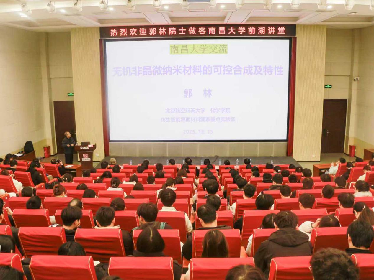 本网讯(化学化工学院,学生记者钟淦萍)12月15日,中国科学院院士、北京航空航天大学化学学院教授、仿生界面材料科学全国重点实验室副主任郭林教授应邀做客南昌大学“前湖讲堂”第四十期,以《无机非晶纳米材料的可控制备及特性》为题作学术报告。副校长聂少平主持报告会。