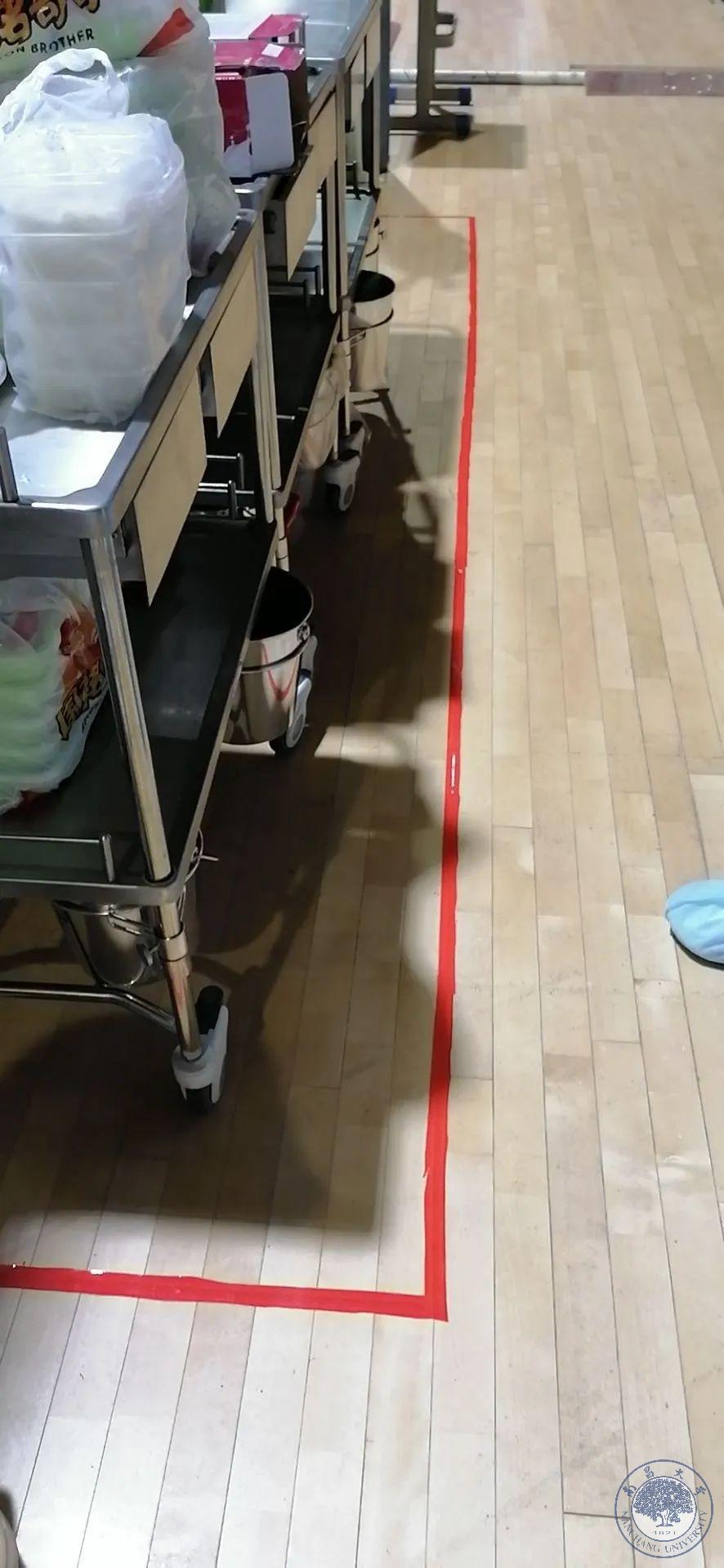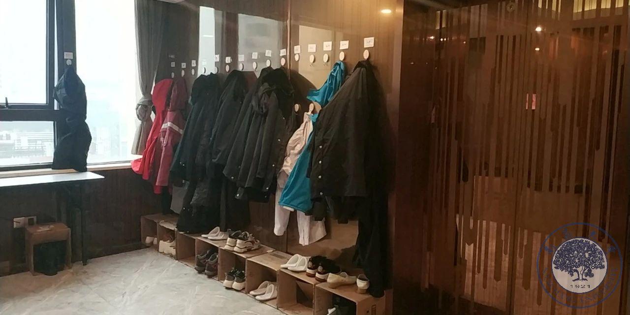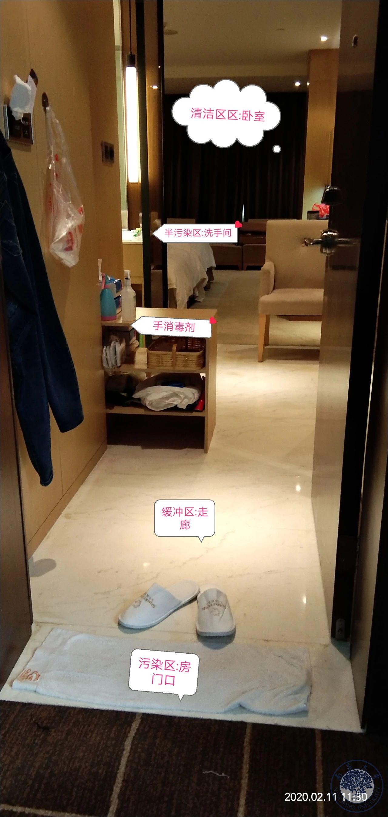 除了舱内,驻地的“三区”感控管理也同样重要。在酒店大堂、楼层走廊、房间都进行了严格“三区”划分,由外至内划为污染区、半污染区、清洁区。酒店大堂门口放置了消毒地垫,队员们进入酒店前在地垫上消毒鞋底,身上喷洒消毒水,使用纸巾无接触方式进入电梯内。在楼层电梯旁设置好了衣帽钩,鞋盒统一摆放,队员在这里脱下外套、口罩、帽子,换鞋,并再次手消毒后才能进入房间。每名队员房间也均按三区划分,在门口脱下护士服,然后进入卫生间洗浴,最后才能进入卧室清洁区。