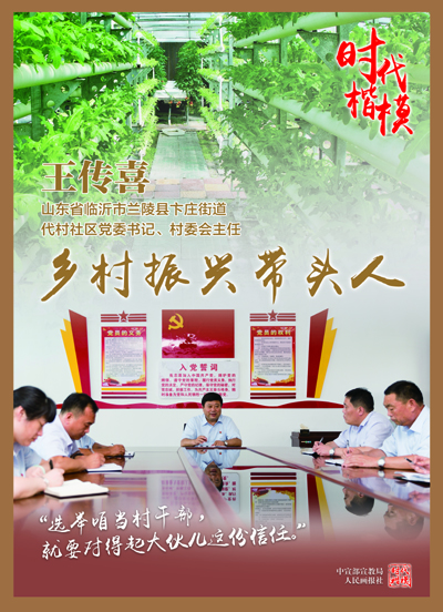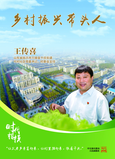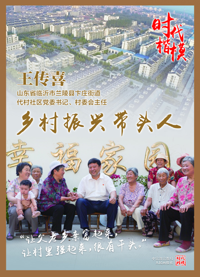 王传喜是山东省临沂市兰陵县卞庄街道代村社区党委书记、村委会主任,党的十九大代表。他担任基层党组织书记19年来,率领村“两委”班子和党员干部加强基层组织建设,发挥党员先锋模范作用,筑牢村庄发展根基;团结群众发展现代农业,壮大集体经济,实现村民共同富裕;积极推动乡村有效治理,倡导文明新风,不断提升群众获得感幸福感。王传喜始终牢记共产党员的初心使命,模范践行新时期沂蒙精神,干事创业、服务群众,赢得了干部群众的广泛赞誉,曾先后获得全国劳动模范、全国优秀共产党员等荣誉称号。