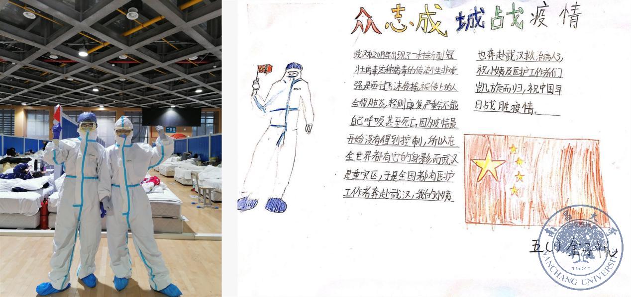 为了让家人朋友放心,告诉亲朋好友我在武汉一切都好,分享了一张工作照。我的小外甥五年级金子悅同学竟然为我作了一幅画,并起了一个好听的标题“众志成城战疫情”。我想与其说金子悅同学画的是他小姨,不如说孩子画的是心目中成千上万抗疫在一线的医务工作者。