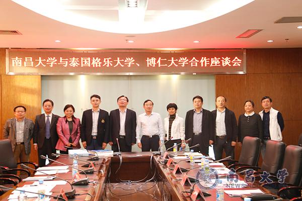 喻晓社代表南昌大学介绍了学校学科建设、人才提升计划、国际合作与交流等方面的情况,王长明简要介绍了泰国格乐大学、博仁大学的办学历程、优势学科、发展动态以及与中国高校合作交流的概况。双方就师生交流交换、学生暑期夏令营活动、科研合作、学术会议及学生2+2和人才培养模式等多形式、多领域的合作进行了交流探讨,并希望以“一带一路”的发展战略为导向,以国际合作为平台,通过“走出去、引进来”,加强双方优势学科的合作,不断提升学校教学、科研及管理水平。
