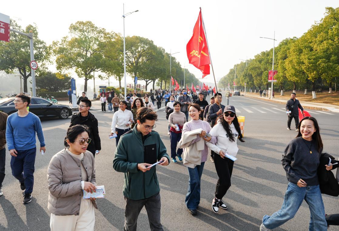 校党委书记罗嗣海、副校长葛刚、平卫英,学术副校长董安平,校党委常委刘建光、徐亮、谈振兴,建行江西省分行党委委员、副行长兼南昌分行党委书记、行长张军,建行南昌分行党委委员、副行长敖松林与近2400名教职工从前湖校区学府大道正门出发,启程香樟校园之旅。