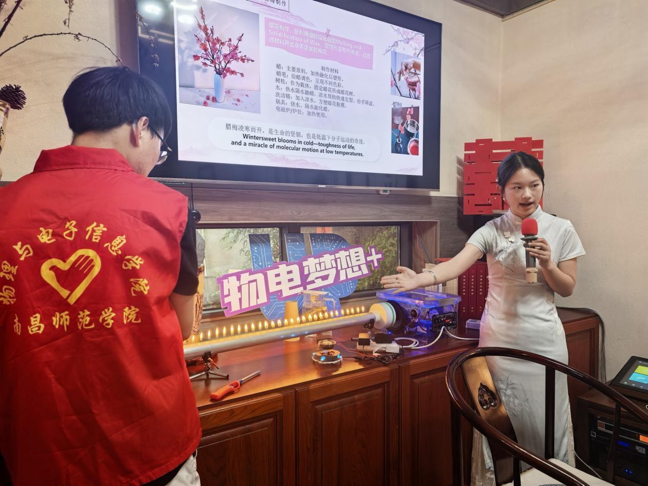 南昌师范学院“物电梦想+”科普团队的师生们用物理学实验,将非遗打铁花、声焰磁浮秀搬进院子。铁粉在空中绽放出金色火花,如繁星坠落;火焰在磁场中悬浮、旋转,科学与东方美学在同一个空间里碰撞。