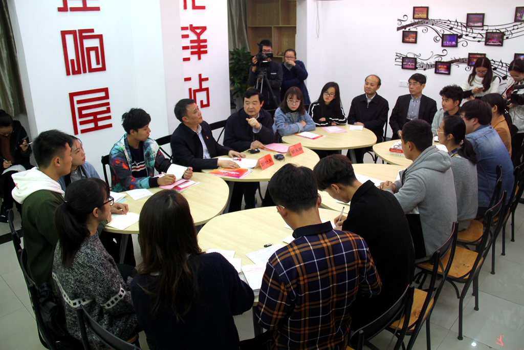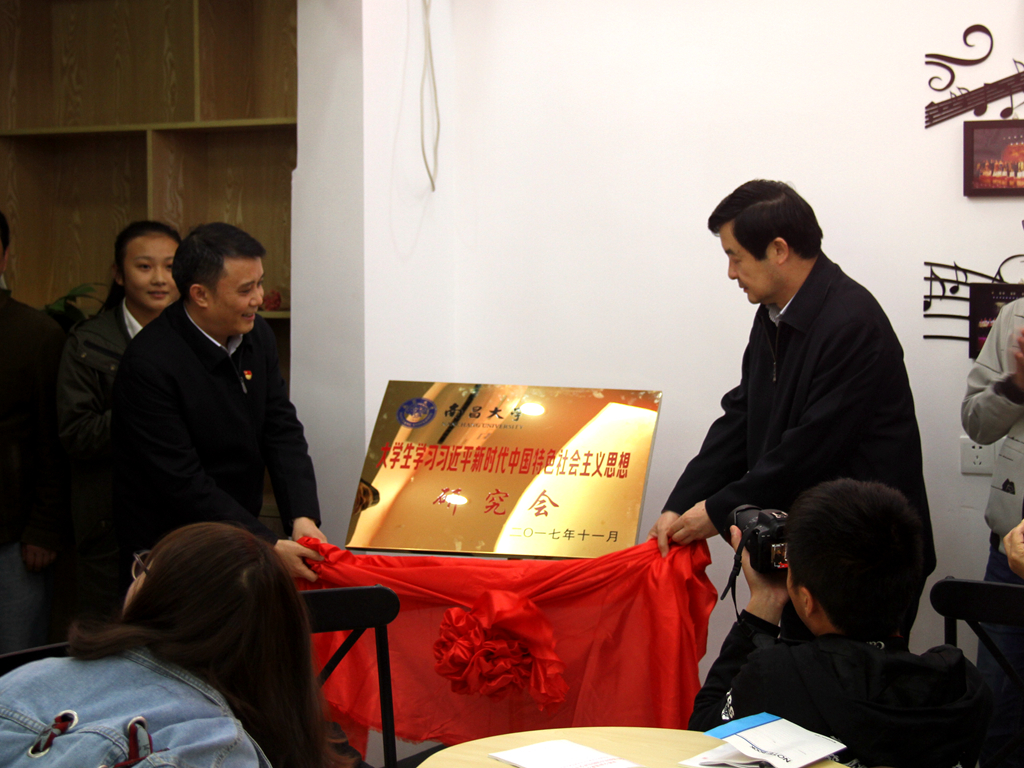 报告会结束后,彭世东来到学生公寓18栋理学院“先锋站·理响屋”学生党建工作特色基地,与青年大学生就深入学习宣传贯彻十九大精神主题进行了互动交流,对大学生如何更好地学习宣传贯彻党的十九大精神提出了指导意见。互动交流前,彭世东、胡永新共同为“南昌大学大学生习近平新时代中国特色社会主义思想研究会”揭牌。成立该研究会是学校在大学生当中深入开展学习宣传贯彻十九大精神的一项创新举措,目的是为给全校学生提供一个学习交流、研究提升的平台,更好地推进十九大精神与学生成长成才的紧密融合。互动现场气氛热烈,学生们踊跃提问、谈感受,专家热切回应、做指导,掌声笑声不断,交流一直持续到下午近六点,中央电视台、江西日报、江西人民广播电台、江西卫视等媒体进行了现场采访。