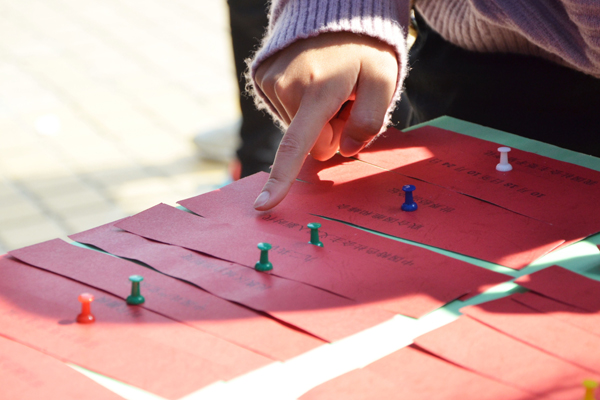 此次活动不仅局限于宣传展览的形式,更是着重关注了与师生的互动,采用寓教于乐的学习形式,设立了打卡闯关的趣味活动环节,吸引了许多同学驻足围观。闯关分为“拼祖国山河”、“寻关键词语”、“识赤色足迹”、“铸信仰之魂”、“看理研岁月”五关进行。许多同学都积极领取打卡单进行闯关,闯过三关及以上的参与者可以获得奖品,且凭借打卡单可与国旗合影。