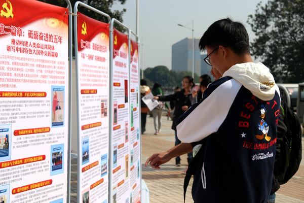 活动场地设置在人流量较大的主教楼前,下课时间一到,一批又一批的同学就从四面八方涌向这里,他们时而驻足观看展板上的党的十九大宣传知识,时而向在场的理研会工作人员询问相关的报告内容,时而三三两两在展板前讨论相关内容。