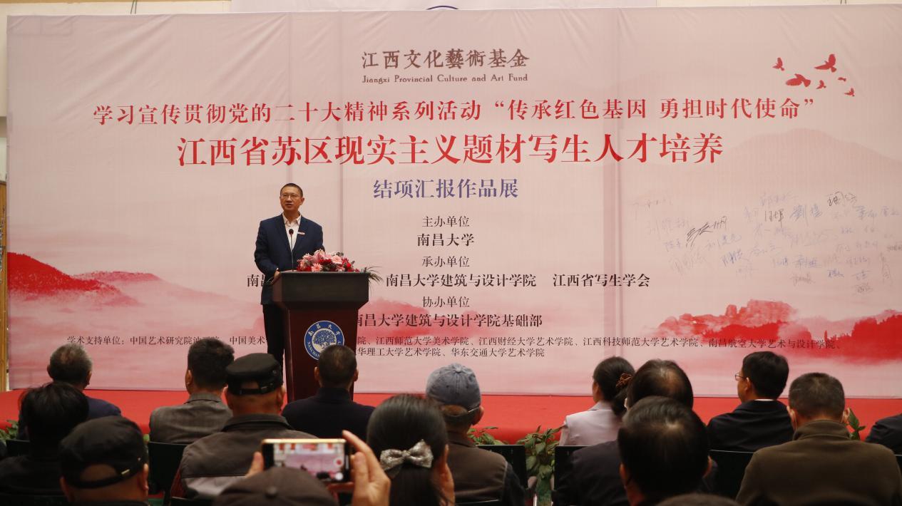 本网讯(建筑与设计学院)11月5日上午,由南昌大学主办,校党委宣传部、建筑与设计学院、江西省写生学会承办的“传承红色基因,勇担时代使命”江西文化艺术基金《江西省苏区现实主义题材写生人才培养》结项汇报作品展在我校美术馆举行。副校长刘耀彬宣布展览开幕。来自省文化和旅游厅及全省各大高校的专家学者40余人参加开幕式。