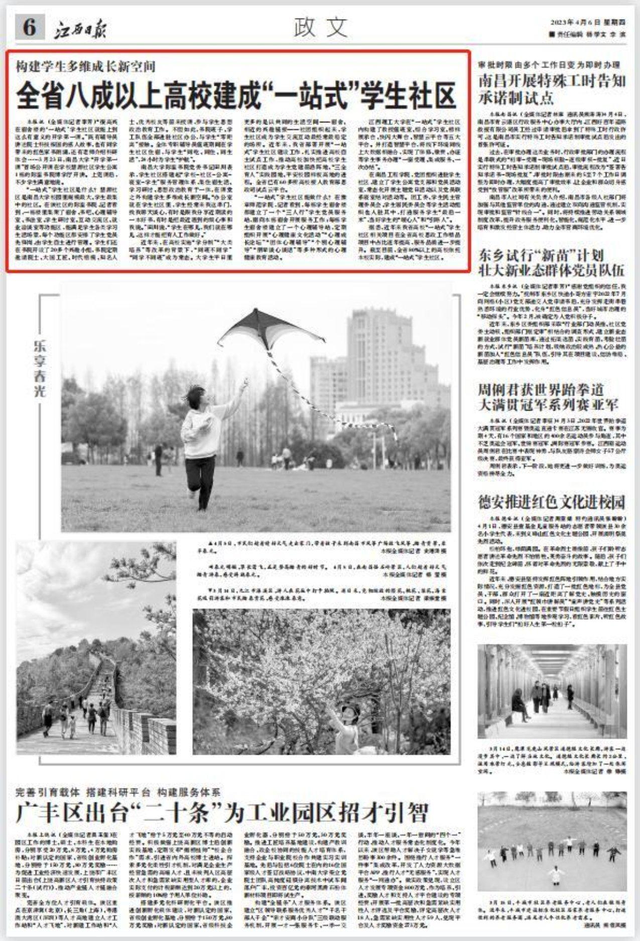 编者按:4月6日,《江西日报》以《构建学生多维成长新空间 全省八成以上高校建成“一站式”学生社区》为题刊发综合新闻,其中报道南昌大学搭建起“学校-社区-公寓-寝室-学生”服务管理体系,集住宿生活、学习研讨、思想政治教育于一体的“一站式”学生社区。原文如下: