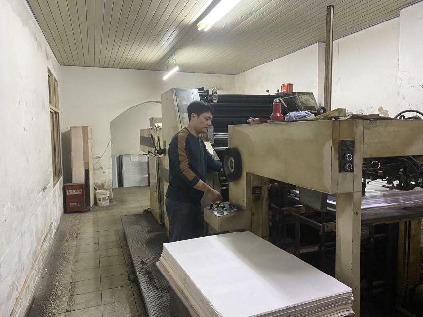 傅平勇印刷的产品,向来以墨色均匀、字迹清晰、质感妥帖著称。问及其中的诀窍,他平静地分享起多年积累的经验:“印刷不是简单的机械操作,要根据纸张的材质、吸水性,精准调节机器压力,让水墨达到完美平衡;还要贴合纸张特性,调整吸风与收纸系统,才能保证每一页成品都合格。”旁人看到的完美成果,实则是他与纸张、机器的默契对话,是“熟能生巧”背后无数次的打磨与沉淀。