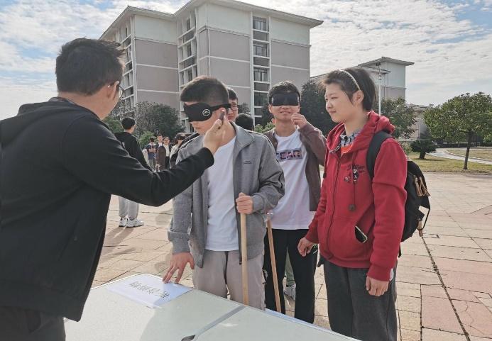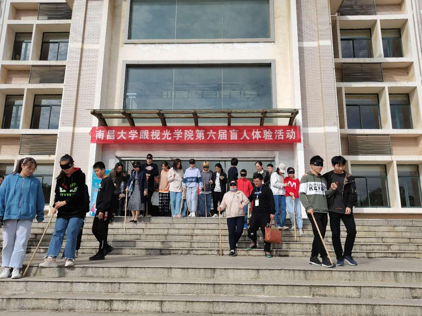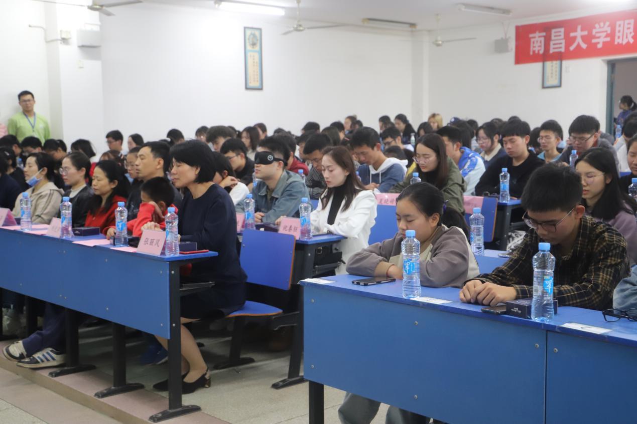本网讯(附属眼科医院)10月25日上午,眼视光学院在前湖校区举办“关爱盲人·珍惜光明”第六届盲人体验活动启动仪式。学工处副处长兼资助中心主任王芳、场馆管理中心主任刘光宇、基础医学院党委副书记胡蓉,眼视光学院学生党总支书记张丽风、班导易昀敏、艾丽珍、邓良良、 学工办副主任祝春钰,全体学工工作人员、各兄弟学院学生代表以及眼视光学院全体学生共200余人参会,会议由院团学联主席陈靖萱主持。本次活动共有85对体验者和志愿者参与,其中还有教工代表8岁的孩子加入体验者的行列。在三个小时黑暗中,“盲人”体验者们顺利完成室内听音、听音辨物、摸棋识子、模拟盲道、超市购物、自给自足、餐厅就餐7个体验活动。