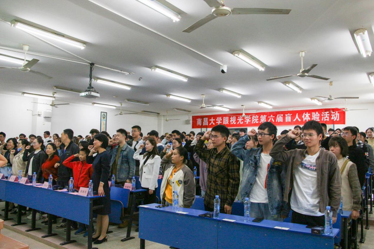 仪式上,张丽风希望通过体验活动每一位体验者在三小时的黑暗中用心感受盲人的艰辛,呼吁大家一起关爱盲人、珍惜光明。观看盲人体验宣传片后,陈靖萱领誓:“ 我以一名南大学子的身份,用我的名字、我的人格起誓:我将忠于誓言,在整个体验活动中,积极参与,诚实完成每个环节,信守承诺,用心体会,用爱寻找光明。”