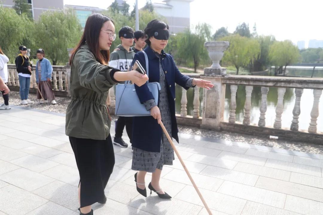 听觉体验过后,体验者们走向户外,在盲杖和引导者的指引下,他们每向前走一步,都更能理解盲人一分。一位体验者同学说:“身处黑暗之中,一开始非常没有安全感,即便引导者告诉我可以放心往前走,我也不敢迈大步子,总害怕自己踩空,害怕会撞到障碍物。”