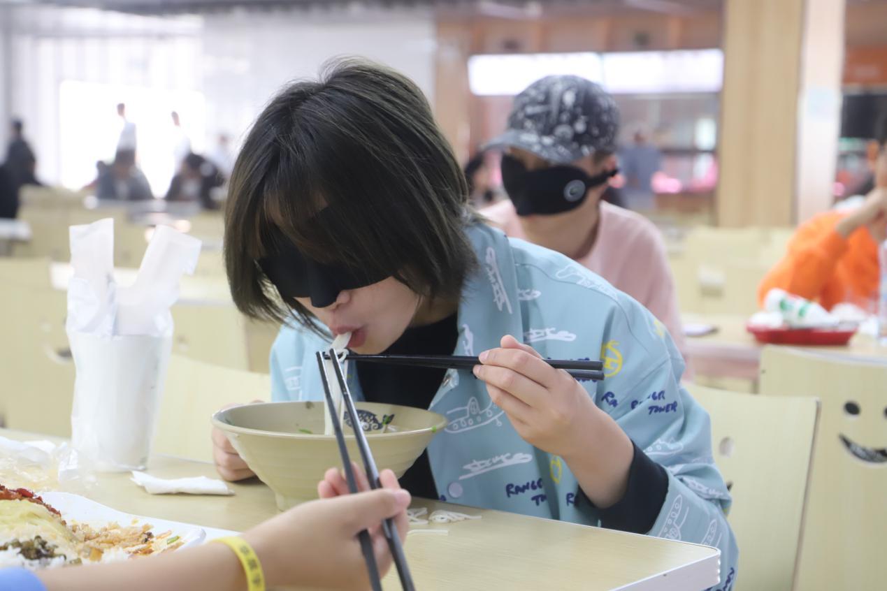 “你是我的眼,带我穿越拥挤的人海……”,嘹亮歌声引领体验者们穿越食堂拥挤人群,寻着气味完成了黑暗世界中的第一次就餐。