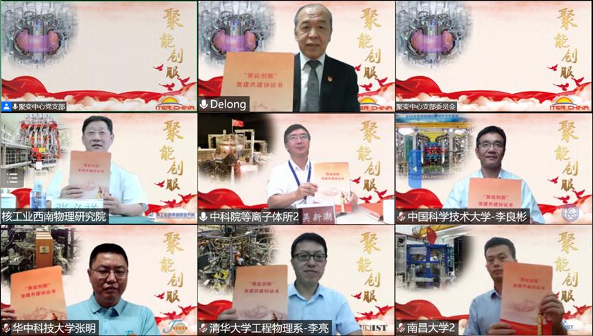 在习近平总书记向国际热核聚变实验堆计划重大工程安装启动仪式致贺信两周年之际,7月28日下午,中国国际核聚变能源计划执行中心牵头,联合核工业西南物理研究院、中科院等离子体所、中国科学技术大学、华中科技大学、清华大学和南昌大学六家国内拥有核聚变实验装置的单位,共同举办了“聚能创服”党建共建协议线上签约仪式,相关单位院系党政负责人出席仪式并致辞。以期通过党建联合共建的形式,加强国内聚变研究单位互通互联,促进国内聚变事业实现更好更快发展。