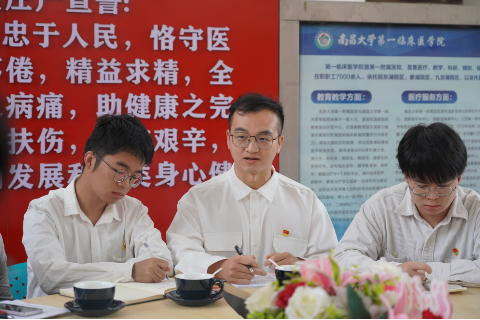 6月4日上午,“书记有约·共上一堂思政课堂(第一期)”活动在第一临床医学院举行。南大一附院党委书记廖岚以“青春 奋斗 为中国式现代化挺膺担当”为主题同一临院的10余名预备党员、入党积极分子进行深入交流,上了一堂精彩、生动的思政课。医院党委宣传部负责人,第一临床医学院学生党总支书记、各年级辅导员参加活动。