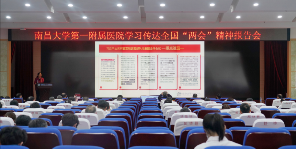 本网讯(第一附属医院)3月14日下午,一附院召开学习传达全国两会精神报告会。全国人大代表、一附院院长张伟传达全国两会精神,党委书记谭友文主持,在家院领导班子成员,党总支书记,职能处室、临床医技科室负责人,科护士长等200余人参加。