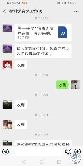 本网讯(材料科学与工程学院 通讯员王坤)为了让广大学生深入学习领会习近平总书记关于抗击疫情的重要指示批示、重要讲话精神,引导学生深入理解“疫情无情党有情,强起来的中国是靠山”主题内涵,为此次中国战“役”大思政教学活动起好步、开好头。材料科学与工程学院高度重视,统一部署、精心安排,组织全院学生开展线上学习,引起强烈反响。