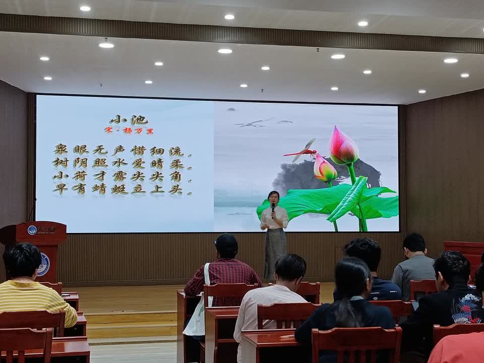 图书馆老师带领大家齐声朗读杨万里的诚斋体著名诗歌《小池》,重点朗读了最后两句,“小荷才露尖尖角,早有蜻蜓立上头”。诗句朗读,让留学生同学们再一次体会到汉语文化的魅力。