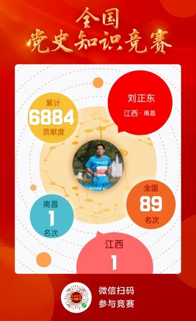 2021年,由党史学习教育官方网站、人民网主办的全国党史知识竞赛中,在5月28日至6月3日赛季中,他还曾以6884累计贡献度、4739赛季贡献度,荣居江西地区第一名,跻身全国百强,并在全赛季最终获得全国“优秀选手”称号。他从学党史中,用心感悟,坚定理想信念,汲取奋进力量;用情感恩,强化初心使命,汲取能量源泉;用行实践,激发担当有为,汲取经验智慧。