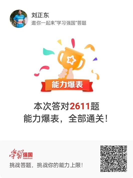5月26日,刘正东在“学习强国”学习平台的挑战答题中,未错一题,连续答对2611题,能力爆表,全部通关!水滴石穿,厚积薄发,心有所信,方能行远。一直以来,刘正东都是一位注重学习、热爱学习的“知识达人”,截止5月26日,他的学习强国总积分达58317分,四人赛积分11145分,这些都绝非一日之功,需要长久坚持。2020年4月7日,他就曾以优秀表现被学习强国“学习平台”推送《连续挑战答题对1030题 我就是给你们带个头》一文。他常说,学习很重要不能只挂在口头上,学习不是一时的目标,而是终身的目的,唯有学习才是进步的有效途径。