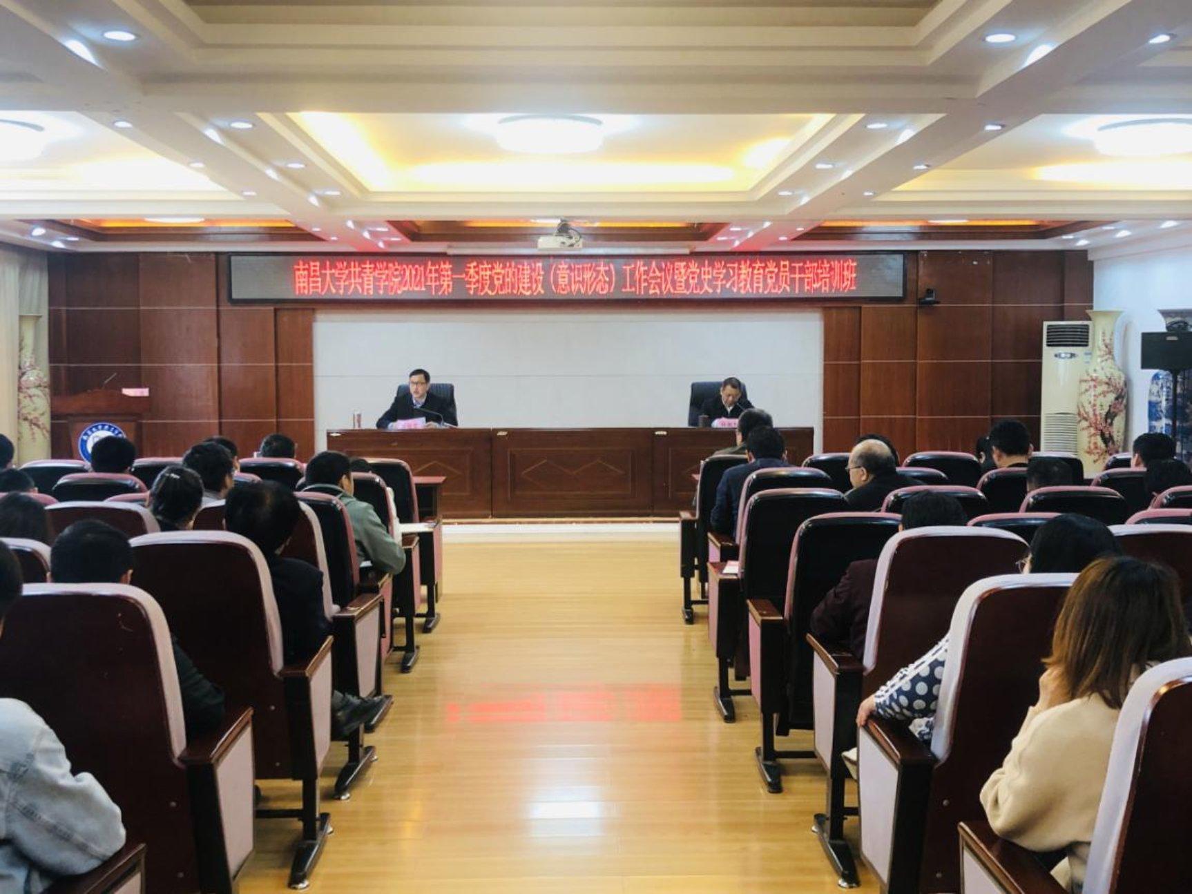 本网讯(共青学院)4月27日下午,学院召开2021年第一季度党的建设(意识形态)工作会议暨党史学习教育党员干部培训班,深入学习贯彻习近平党建思想,落实教育部2021年度高校思想政治工作视频会议精神,总结一年来学院党建取得成绩和经验、分析问题与不足,部署下一阶段工作并开展党史学习教育专题培训。学院相关负责同志出席会议并作专题培训。