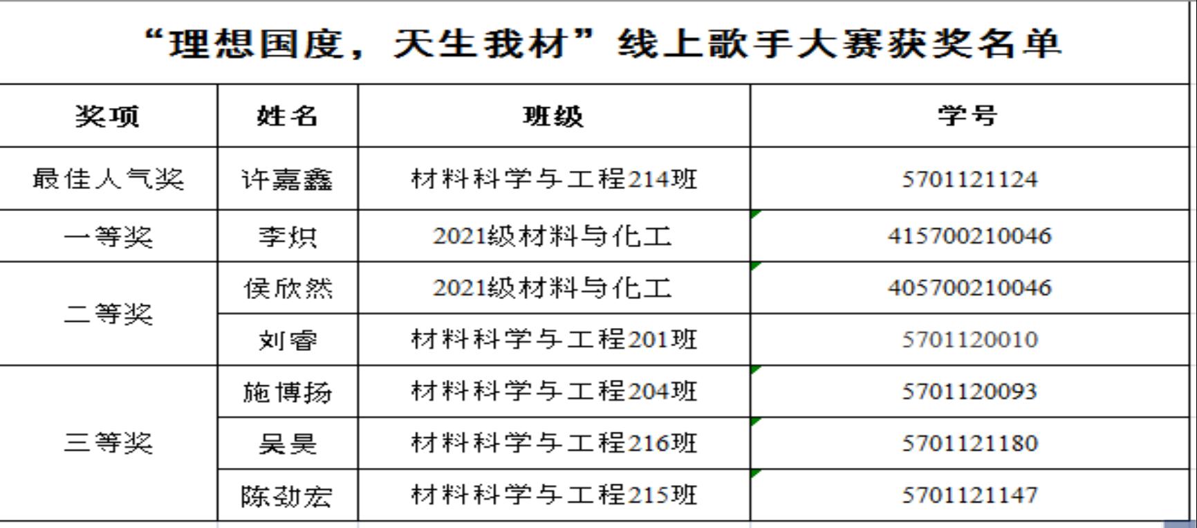 此次线上歌会的主题为“理想国度,天生我材”,旨在将歌手大赛放在线上开展,以此凝聚起广大学子防疫的青春力量。本次线上歌手大赛吸引了来自学院本科生、研究生共计24名选手参加,通过激烈的角逐,李炽同学获得“一等奖”,侯欣然同学和刘睿同学获得“二等奖”,施博扬同学、吴昊同学和陈劲宏同学获得“三等奖”,来自2021级许嘉鑫同学获得“最佳人气奖”。