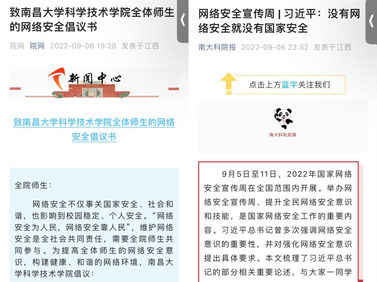 加强宣传引导,营造浓厚氛围。在宣传周期间,学院积极利用教学楼、学生宿舍楼、行政楼、大学生活动中心等楼栋的电子屏,轮播校园网络安全知识和警示标语;校园广播播报网络安全知识,提醒同学们注意保护个人信息安全。同时,学院通过官方网站、微博、微信公众号、报纸、QQ以及微信群等媒介对师生进行了网络安全知识宣传,在学院营造了浓厚的宣传氛围。学院发布《致南昌大学科学技术学院全体师生的网络安全倡议书》,各单位积极转发,倡议全院师生不断提高网络安全意识、提升网络文明素养,从现在做起、从自己做起,坚持文明上网、文明办网,携手共建绿色、安全、文明、和谐的网络空间。通过多种形式进行宣传,让网络安全深入人心。