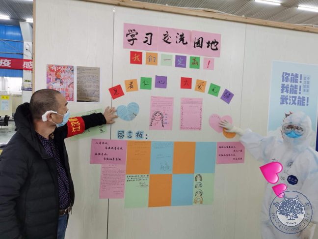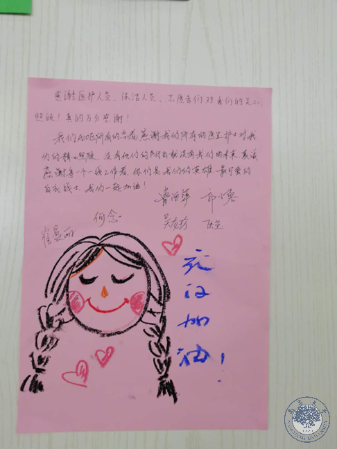 当我推着一车车满满的饭菜穿梭在方舱时,总是有一位位志愿者匆匆的向我跑过来,脸上露出甜甜的笑,说着:“让我们来帮帮你吧!”一天的工作的疲劳也随之消散;当下雨天我在方舱医院排查医院有无漏水情况时,到处都能看到他们主动帮我排查的身影;当痊愈的患者们一个个相继离开时,我知道我们的辛勤付出得到了回报;当患者们痊愈后主动提出留下来做志愿者时,我知道我们的医务工作得到了肯定;当成为志愿者的患者们,给病患递上鼓励的小纸条时,温暖在这个硕大的医院里传递开来......这平凡而又充满感动的日子,不禁让我想起了诗经中的话: