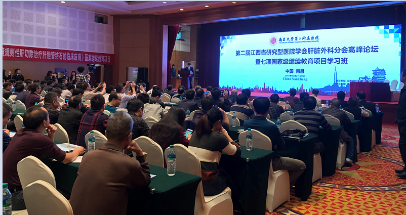 本网讯(第二附属医院)秋色绚烂、福满金秋,第二届江西省研究型医院学会肝脏外科分会高峰论坛暨7项国家继续教育学习班于10月27日-29日在南昌成功召开。此次高峰论坛由江西省研究型医院学会肝脏外科委员会主办、南昌大学第二附属医院肝胆胰外科承办,是江西省肝胆胰疾病领域的一次盛会。会议由“精准外科理念在复杂性肝胆管结石病中的应用研究”(邬林泉,项目编号:2017-04-01-268)、“腹腔镜规则性肝切除治疗肝胆管结石的临床应用”(黄长文,项目编号:2017-04-01-266)、“腹腔镜脾切除断流术治疗门静脉高压症”(殷香保,项目编号:2017-04-01-270)、“门脉高压介入治疗进展”(谢正元,项目编号:2017-03-03-361)、“加速康复外科理念在肝切除患者临床护理中的应用”(林雪琴,项目编号:2017-03-03-361)、“肝胆外科快速康复外科研讨班” (黄跃英,项目编号:2017-14-02-118)“重症急性胰腺炎的护理新进展”(李雪芹,项目编号:2017-14-01-122)七项国家继教项目结合,来自省内400余名普外科医生及护理人员参加了此次论坛。南昌大学第二附属医院邵江华教授担任大会名誉主席,邬林泉教授担任大会主席。