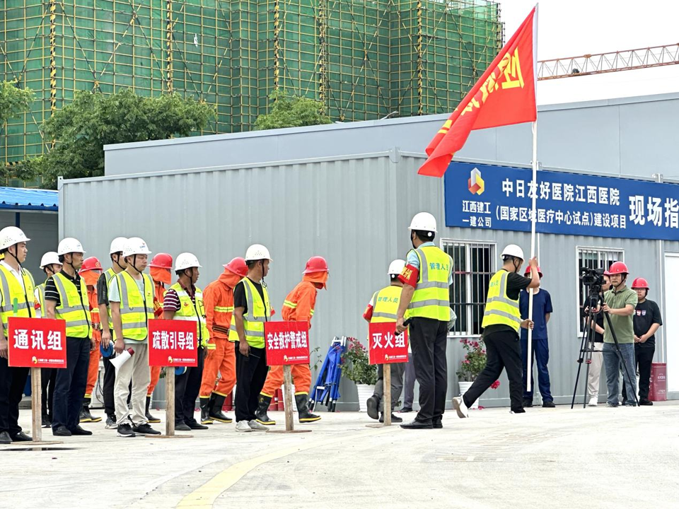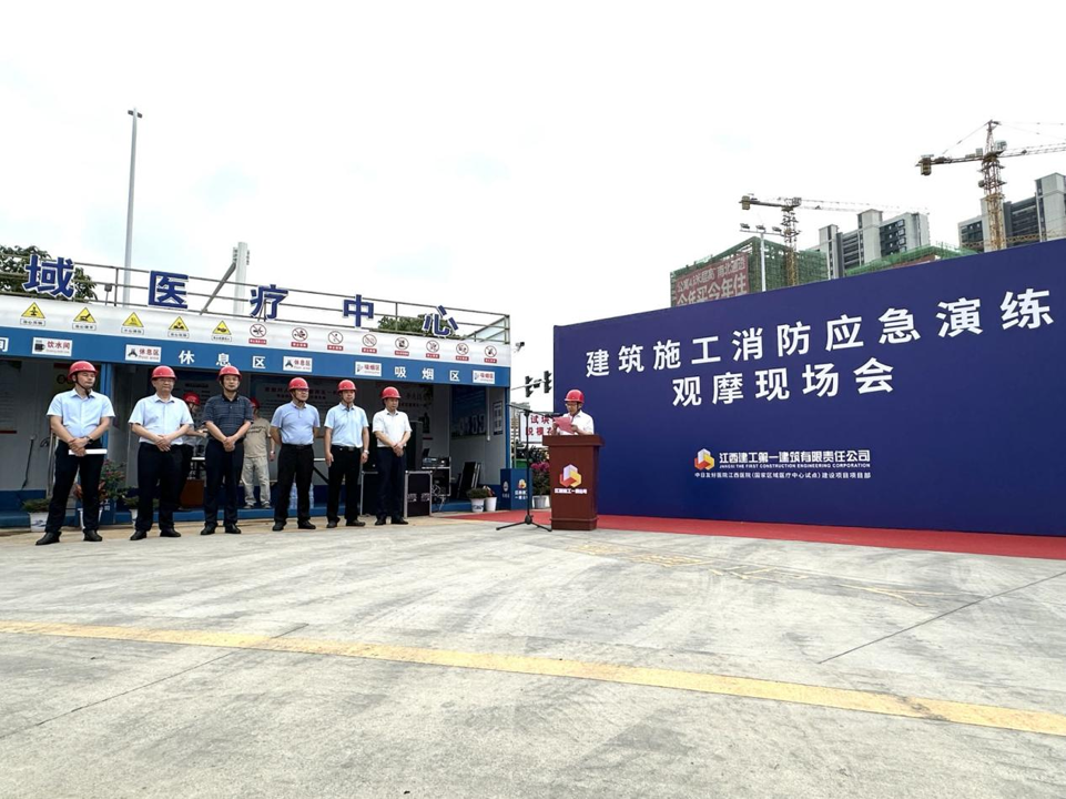 本网讯(第一附属医院)为认真贯彻落实习近平总书记关于安全生产的重要论述和重要指示批示精神,践行全国第23个“安全生产月”活动,助力安全生产治本攻坚三年行动,筑牢医院安全生产防线,6月14日下午,中日友好医院江西医院(国家区域医疗中心试点)建设项目举行建设施工消防应急救援演练。省住建厅二级巡视员陈杰,第一附属医院党委副书记王仕旺、党委委员刘志礼,省城镇发展服务中心质安处处长蔡正杰、省住建厅建管处副处长黄兴、省建工集团有限公司副总经理陶立新,省建工集团第一建筑有限公司总经理涂发强出席,后勤保障部基建处、保卫部负责人到场观摩演练。