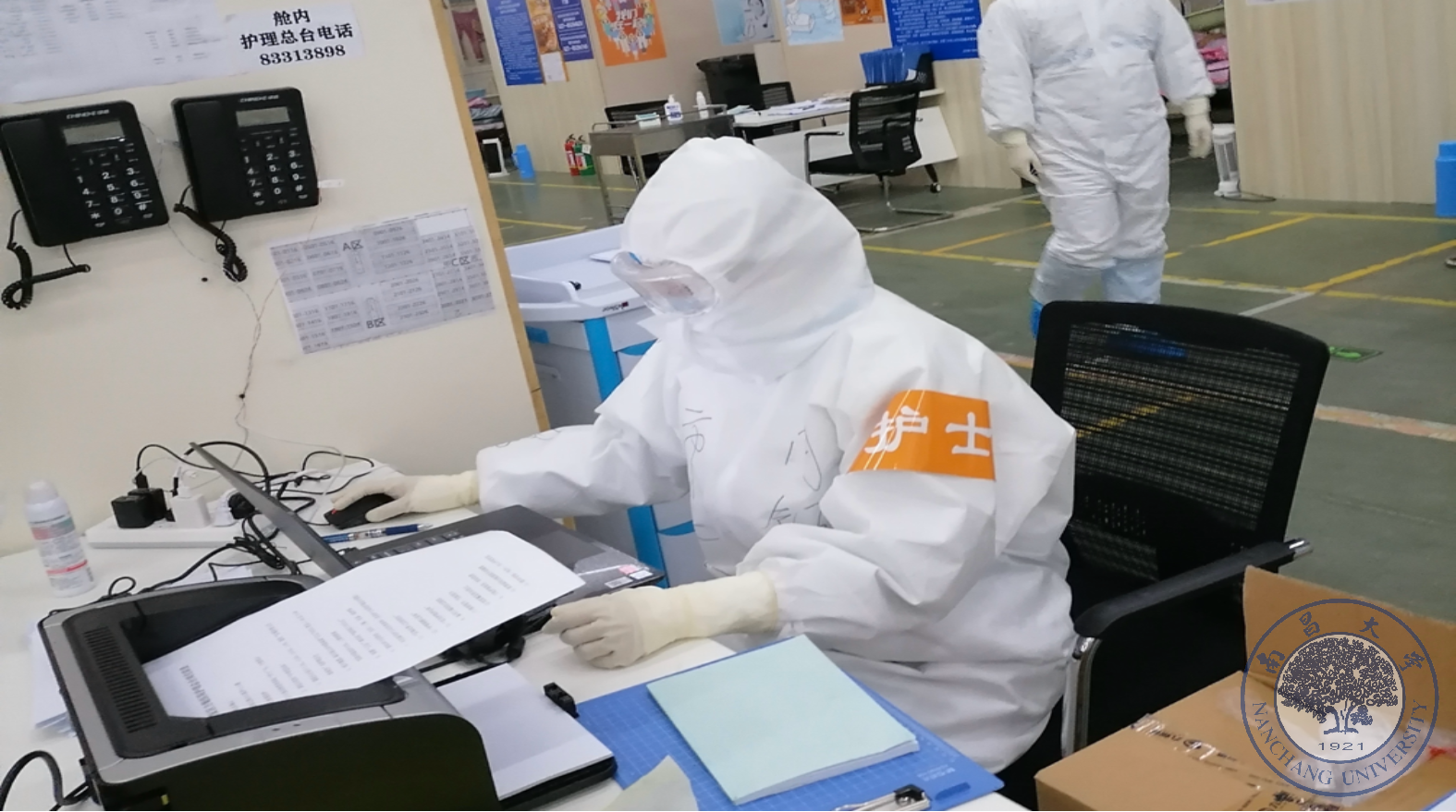今天,比较紧张,第一次担任总台护士。当协和的老师和我交接时说:“晚上的总台就靠你了”的时候,我内心其实还是有点忐忑,不知道自己能不能胜任这个“大管家”。我所在的江汉经开区方舱医院分ABC三个区,分别由广东、江西、天津医疗队接管,每个区都有自己的医生和护士,而总台则是负责协调三个区域事务的指挥者。