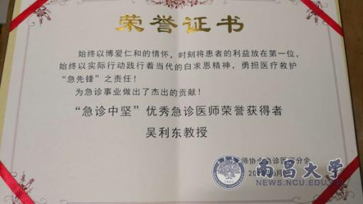 本网讯(第二附属医院)近日,在2018中国医师协会急诊医师年会上,第二附属医院急诊医学科主任吴利东荣获“急诊中坚”优秀急诊医师称号。年会由中国医师协会、中国医师协会急诊医师分会和全军急救医学专业委员会联合主办,奖项重在表彰在急诊临床工作中有杰出贡献和作为的优秀楷模。今年全国共有10位急诊医师获此殊荣,吴利东是江西省唯一获得此荣誉的代表。