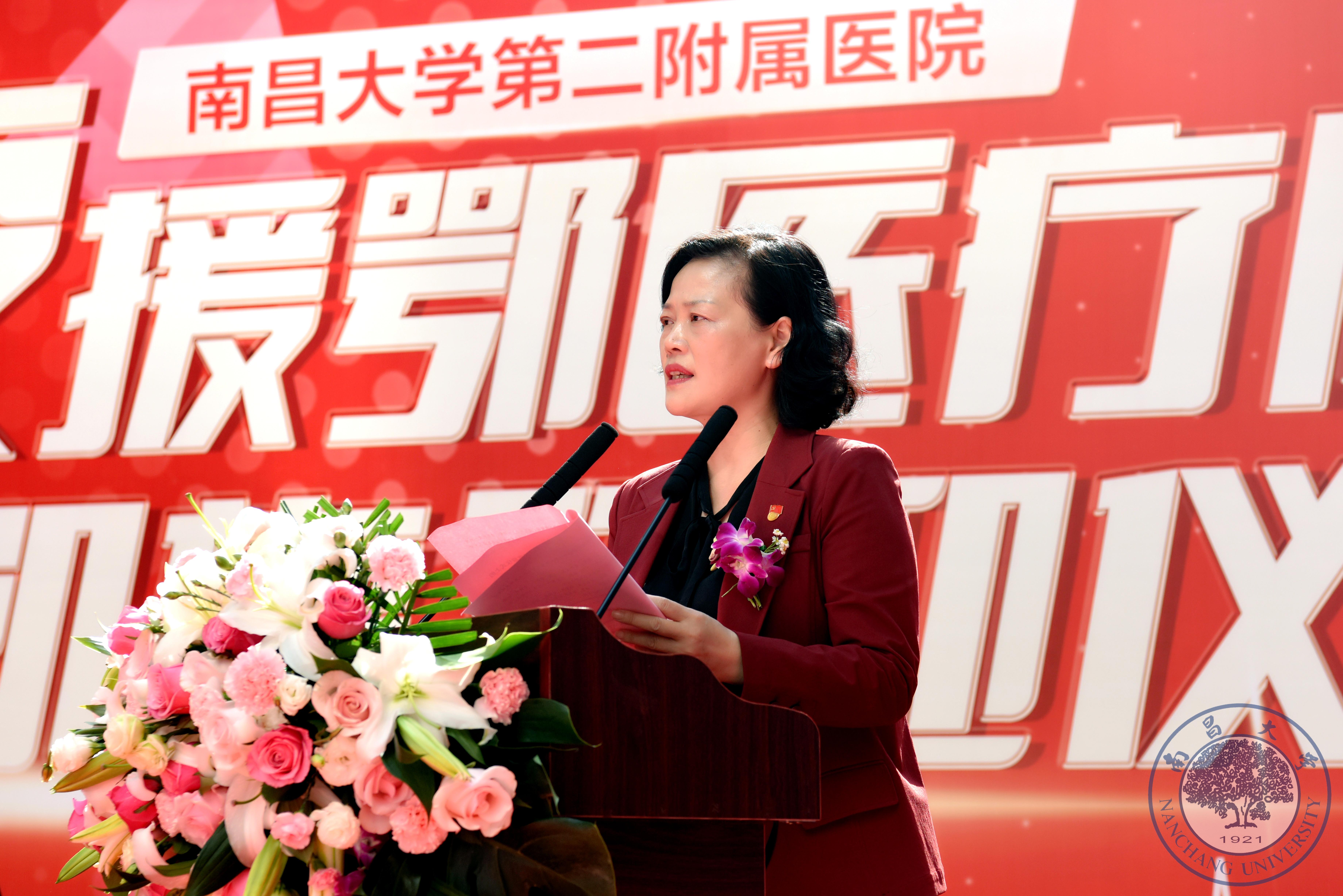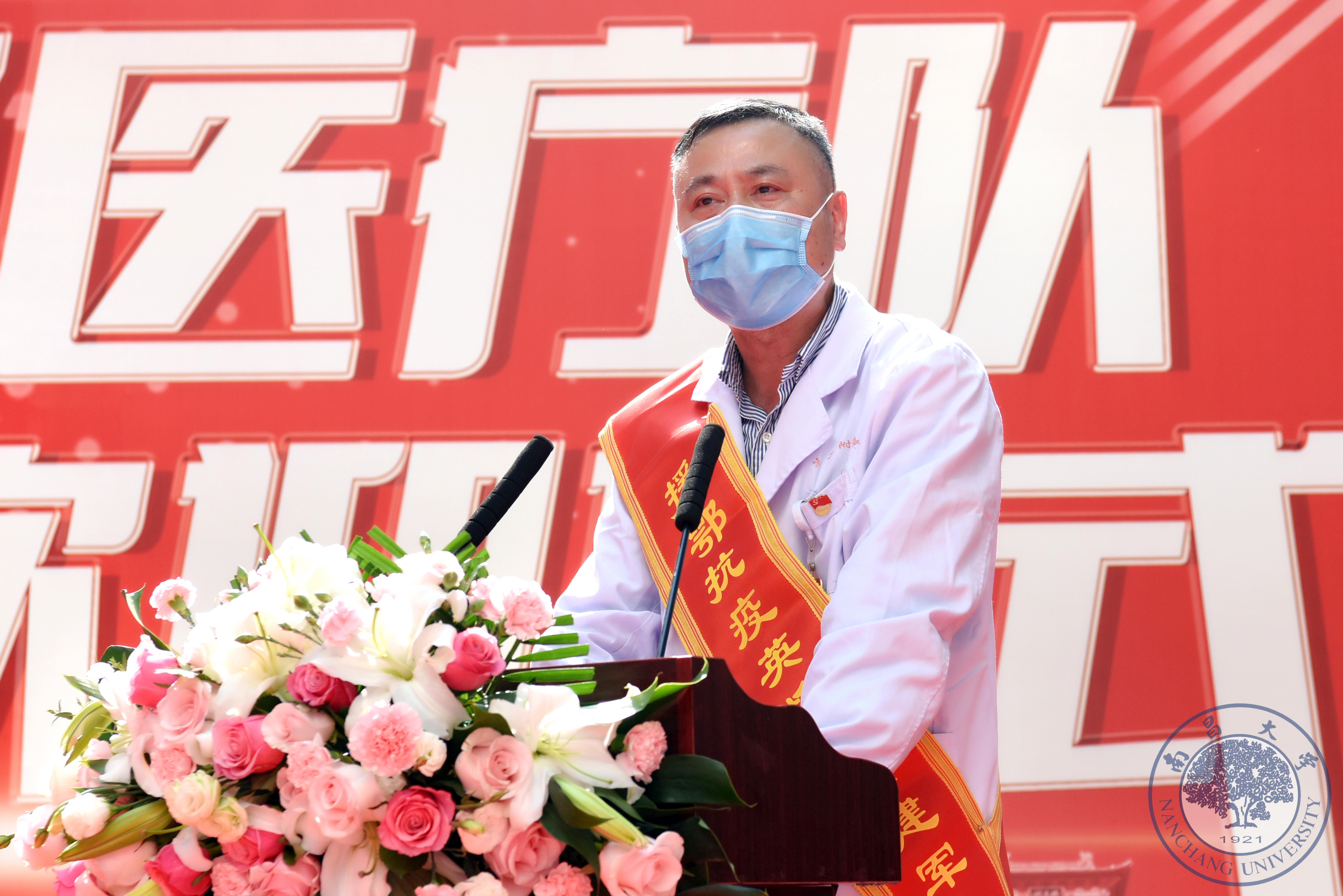 徐建军在讲话中说道,奔赴疫区驰援武汉,是一次难忘的逆行经历,是一次难得的自我成长过程,是人生的一次大考。南昌大学二附院抗疫援鄂国家医疗队没有辜负江西人民及医院的期望,取得了“收治病人零死亡,出院患者零返院,医护人员零感染”的骄人战绩。他代表医疗队向医院党委行政和同事们的关心关怀表示感谢,并强调,全体队员已将这次武汉战疫之路转化成人生中最宝贵的精神财富和激励自己无畏前行的强大动力,从今天开始,将会以最佳的状态、最饱满的精神,重返工作岗位,以更好的工作成绩回馈院党委行政和全体二附院人的厚爱!