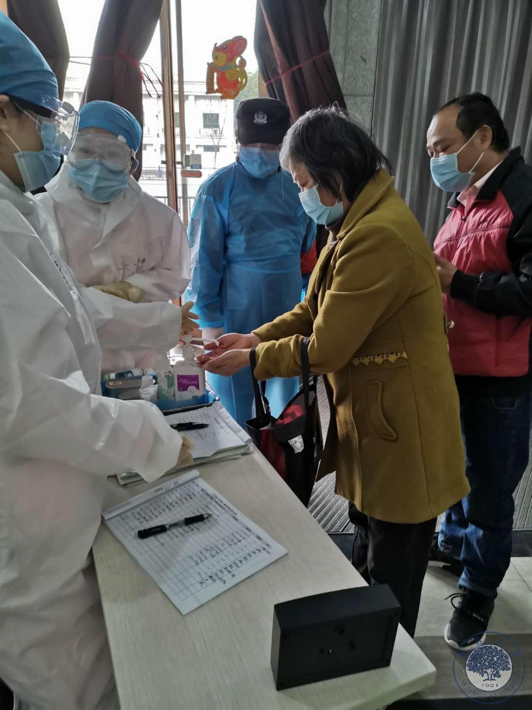 随着复工返昌潮的开始,门诊病人量较之前明显增加。为防止就诊时人员聚集,预检分诊工作台前移,医院设置1.5米等待区,安排专人协助患者提供各项验证信息,在室外大棚里对每一位就诊患者及陪同家属进行详细的流行病学史查询,保证患者及家属、医务人员的安全。两个预检分诊台能够有效分流人员,确保一人一消,同时将进口出口分设,专门设置出口,出入分流,严防交叉感染。