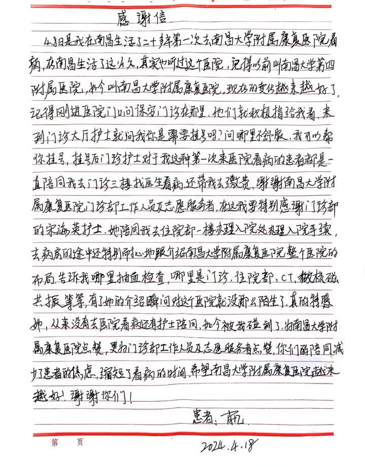 本网讯(第四附属医院)“你们的陪同减少了我的焦虑和紧张,很快地完成了各项检查,办理好了入院手续,谢谢你们,你们辛苦了!”