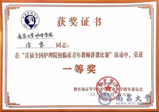 我校临床带教老师涂惠代表南昌大学护理学院参赛,涂惠老师通过生动、精彩的讲授,由浅入深、循序渐进地阐述了讲课内容和要点,授课过程中多次互动、引导学生积极思考,注重临床思维的培养和护理人文关怀教育,展现了自身过硬的专业素质和独特的讲课风格,从来自全国的168名选手中脱颖而出,取得了一等奖的优异成绩。