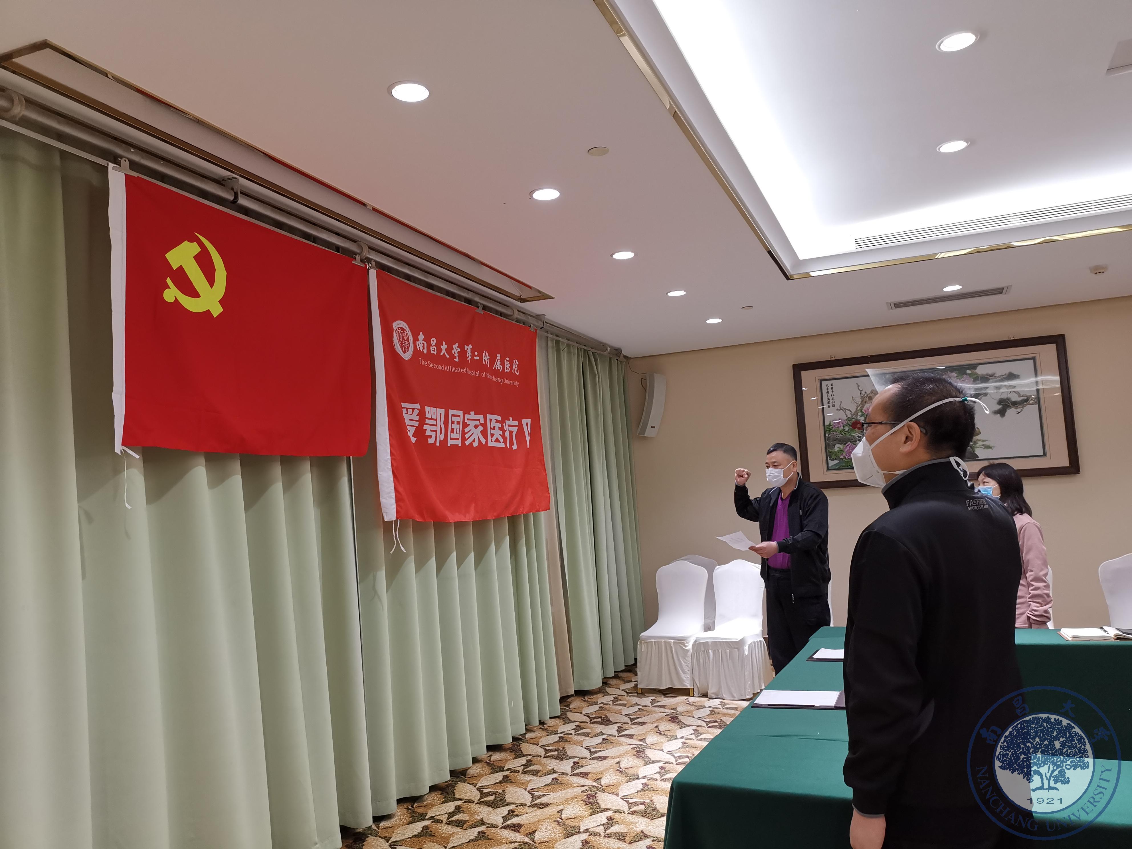 本网讯(通讯员王恺)3月27日下午5:30,南昌大学第二附属医院抗击新冠病毒肺炎援助湖北国家医疗队临时党支部在驻地为第二批火线入党的16位同志举行了入党宣誓仪式,战疫一线党组织再增强大力量!