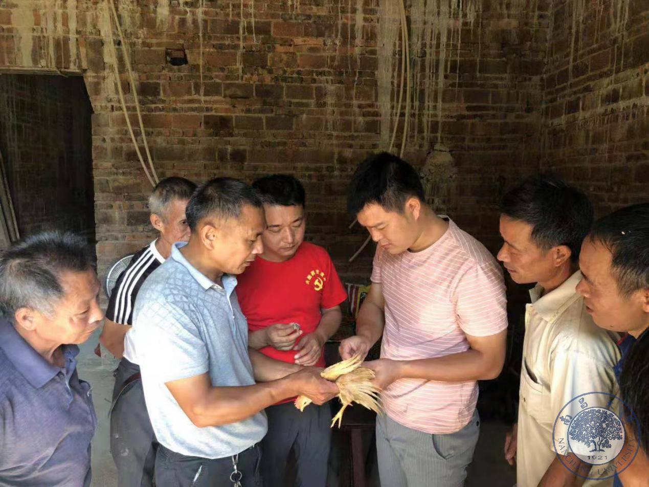 ▲扶贫工作队正在帮助村民检查鸡苗成长情况(供图:徐睿来)