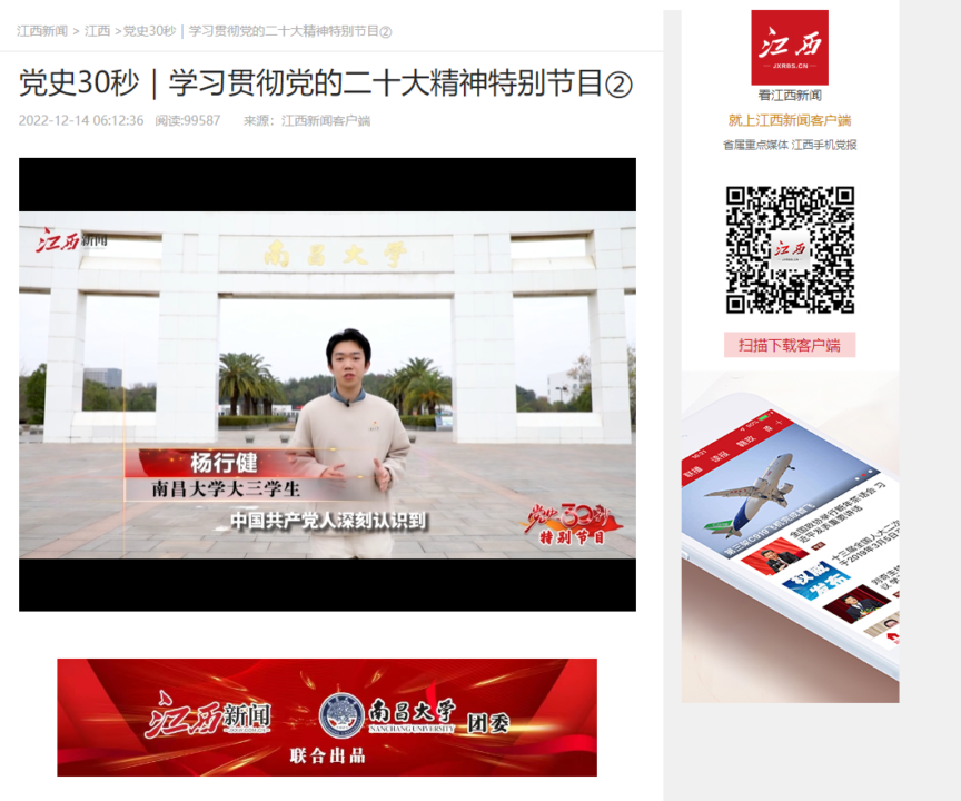 本网讯(团委 饶安琪)为深入学习宣传贯彻党的二十大精神,南昌大学团委联合江西日报推出“学习贯彻党的二十大精神”特别节目。节目邀请来自不同年级、不同专业的南大青年学子,以系列微视频形式,带领大家原原本本、原汁原味、逐字逐句研读党的二十大报告,认真领悟党的二十大报告提出的新思想、新论断,作出的新部署、新要求,持续营造学习党的二十大精神的浓厚氛围。