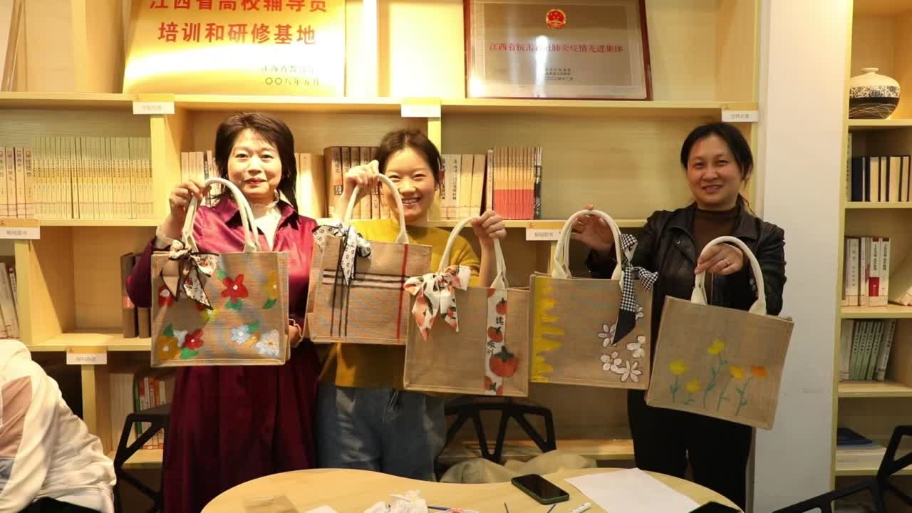 活动现场轻松愉快,与会老师热情高涨。大家在黄老师的精心指导下,一边学习手绘技巧,一边构思心仪图案。经过一笔一划彩绘,各色形态生动的艺术造型跃然于之前素面的托特包上。