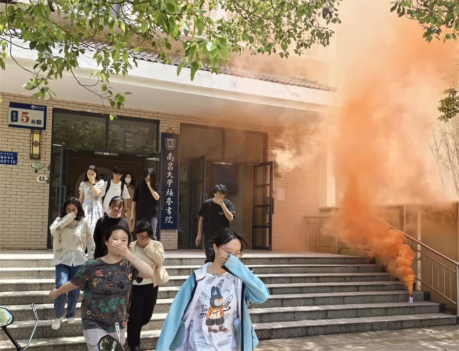 后勤保障组在演习前期准备专用烟雾并设置声光报警。12点30分,听到消防警报及广播后,在疏散引导组成员的引导下,同学们湿布掩住口鼻、弯腰低头,迅速地从距离最近的安全楼梯向楼外安全区域疏散,过程快速、安全、有序。到达集合地点后,工作人员进行人数统计,确保所有人顺利撤离。