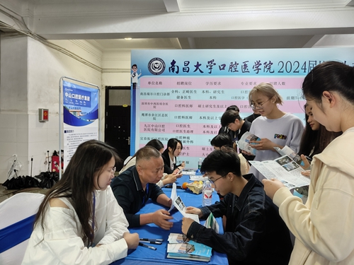 本网讯(附属口腔医院 任晶晶、朱嘉)4月16日上午,南昌大学口腔医学院在东湖医学院教学大楼举办2024届“梦想起航,职引未来”口腔医学毕业生春季招聘会。院长杨健、学生党总支书记赵豫出席。