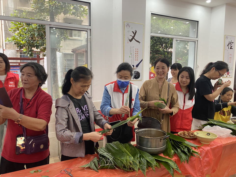 活动现场,志愿者们早早地将提前泡好的糯米、猪肉、红枣、豆沙、粽叶等材料摆放在桌子上,与老人们围在桌旁折粽叶、装糯米、放入馅料、裹扎绳,大家动作娴熟,忙得不亦乐乎。现场其乐融融。