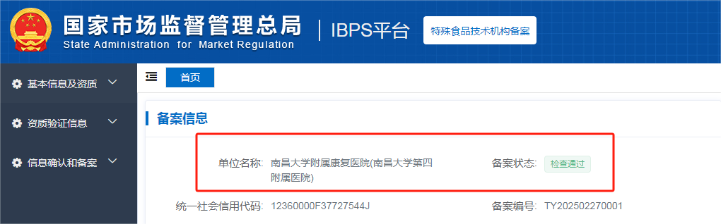 本网讯(附属康复医院)近日,附属康复医院在国家市场监督管理总局“特殊食品验证评价技术机构备案工作管理信息系统”成功备案,标志着医院在特殊医学用途配方食品(简称“特医食品”)验证评价领域迈出了坚实的一步,具备了承担特医食品临床试验验证评价工作资质和能力,为推动特医食品研发与临床应用注入了新动能。